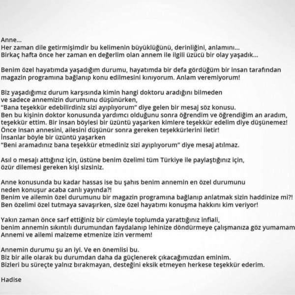 وبعد حديث نور هذا نشرت هاديسا بياناً عبر صفحتها الخاصة لم تنكر فيه ما قالته بل عاتبتها وقالت:” مي هي الكلمة التي عند ذكرها تعرف قيمتها. قبل اسبوع عشنا حادثاً محزناً مع والدتي. استنكر ان يقوم انسان رأيته مرة واحدة في حياتي بجعل امر خاص بي موضوعاً للحديث في برنامج تلفزيوني”.