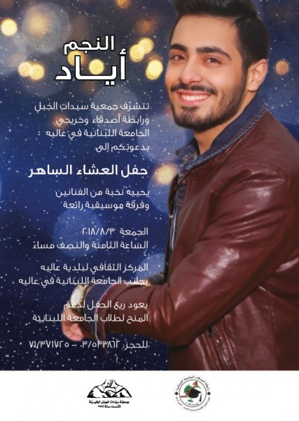 من جهة أخرى ، سيحيي الفنان اياد يوم الجمعة 3 آب / أغسطس الجاري حفل عشاء تنظمه جمعية سيدات الجبل ورابطة أصدقاء وخريجي " الجامعة اللبنانية " .