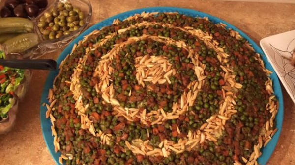7- أسكبي الارز بالخضار في طبق، زيّنيه بما تبقى من البازيلاء والجزر ثم انثري اللوز المحمص على الوجه.