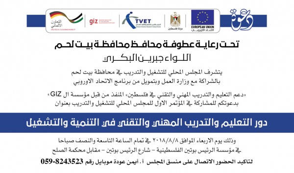 نظم المجلس المحلي للتشغيل والتدريب المهني في محافظة بيت لحم وبالشراكة مع وزارة العمل الفلسطينية وبتمويل من برنامج الاتحاد الاوروبي الخاص بدعم التعليم والتدريب المهني والتقني في فلسطين المنفذ من قبل مؤسسة التعاون الالماني ال GIZ المؤتمر الاول للمجلس المحلي للتشغيل والتدريب حيث ينظم المؤتمر في مؤسسة الرئيس بوتين الفلسطينية.