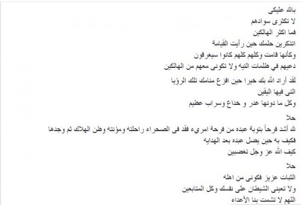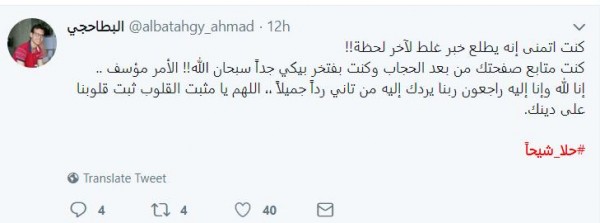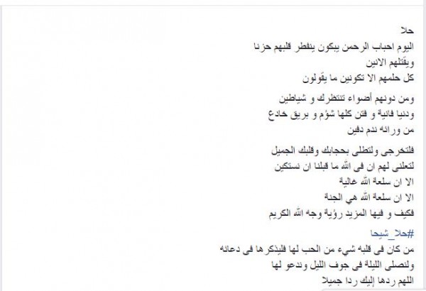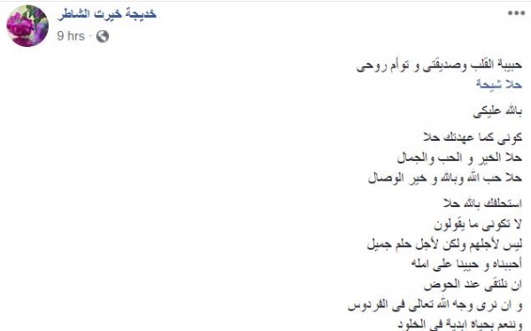 وأكدت خديجة الشاطر- التي اضطرت أن تكتبت المنشور عبر مواقع التواصل بعدما رفضت حلا الرد على اتصالاتها - أنها كانت على اتصال بصديقتها الفنانة حلا شيحة خلال السنوات الماضية وكانت بينهما مشروعات دعوية وأنها يجب أن تعود لنفس الطريق التى كانت تسير فيه