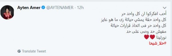 وأضافت في تغريدة أخرى: "أحب افكركوا ان كل واحد حر كل واحد حقة يمشي حياتة زى ما هو عايز كل واحد حر فى اتخاذ قرارات حياتة مفيش حد وصى على حد نورتينا".