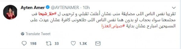 وبات هاشتاج حلا شيحا الأعلى في مصر ، واحتوى العديد من الآراء التي كأن أبرزها دفاع الممثلة آيتن عامر، والتي باركت خطوة حلا ورحبت بها مرة أخرى في عالم التمثيل، وغردت آيتن: "تقريبا نفس الناس اللى مضايقة منى عشان أعلنت تقبلي و ترحيبى ل #حلا_شيحا فى مجتمعنا سواء بحجاب او بدون هما نفس الناس اللى طلعونى كافرة عشان عيدت على المسيحين امبارح عشان بداية #صيام_العذزا"