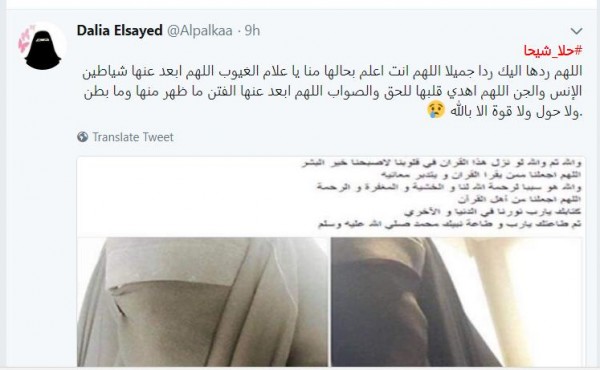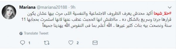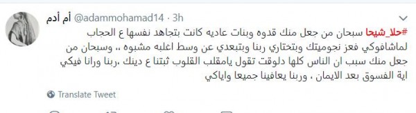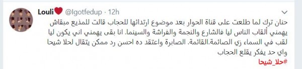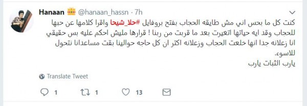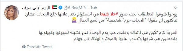 بينما كتبت مصممة الأزياء الإماراتية ومدونة الجمال الريم ليلى سيف: "روحوا شوفوا التعليقات تحت صور #حلا_شيحا في انستقرام بعد إعلانها خلع الحجاب عشان تتأكدون ان مقولة "الحجاب حرية شخصية" من نسج الخيال الحرية لازم تكون في ارتدائه وخلعه، مب يوم الوحدة تقرر تشيله تسبونها وتهينونها وتطعنون في شرفها وتدعون عليها بالموت والهلاك في جهنم".