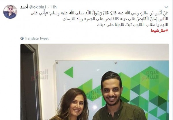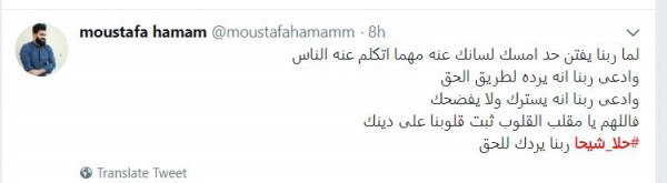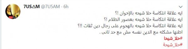 بينما رفض حسام ربط حجاب حلا بحركة الإخوان، وغرد :" ايه علاقة انتكاسة حلا شيحه بالإخوان !؟ ايه علاقة انتكاسة حلا شيحه بعصور الظلام !؟ ايه علاقة انتكاسة حلا شيحه بالهجوم على رجال دين ثقات !!؟ اظنها مشكله مع الدين نفسه مش مع حد تانى ".