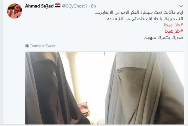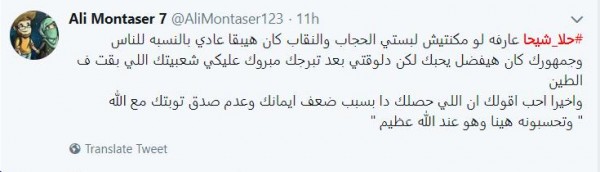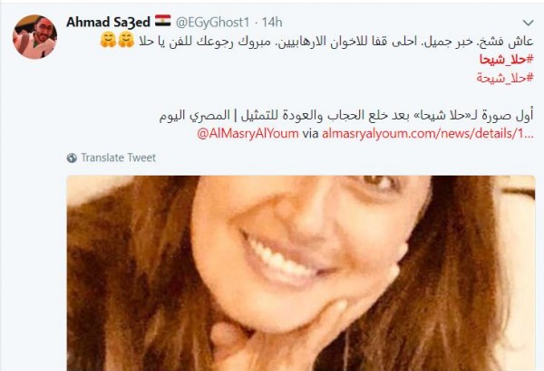 ما جعل أحد المغردين الذي يدعى أحمد سعيد يحتفل بخلعها للحجاب، فنشر صورتها بالخمار وعلق:" ايام ماكانت تحت سيطرة الفكر الاخواني الارهابي.... الف مبروك يا حلا انك خلصتي من القرف ده ، صورك بشعرك مبهجة"، وعلى نهجه علق "العم بوب": " اتمني تكون بدايه موجه معاكسه لجنون العشر سنين الاولي من الالفيه نتيجه خطب ومواعظ عمرو خالد وامثاله".
