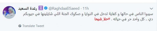 وقالت مدربة تنمية المهارات البشرية وخبيرة لغة الجسد رغدة السعيد: "سيبوا الناس في حالها و كفاية تدخل في النوايا و صكوك الجنة اللي شايلينها في جيوبكم دي .. كل واحد حر في حياته".
