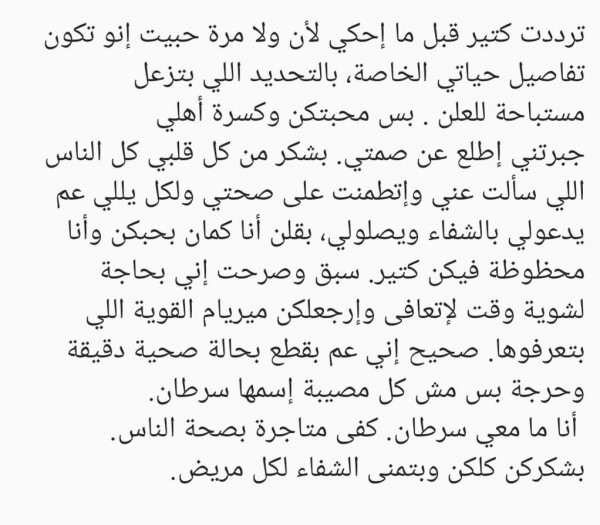 ونفت ميريام أن تكون مريضة بالسرطان، كما أشيع خلال الأيام الماضية، ولم تكشف عن مرضها الذي وصفته بالدقيق.