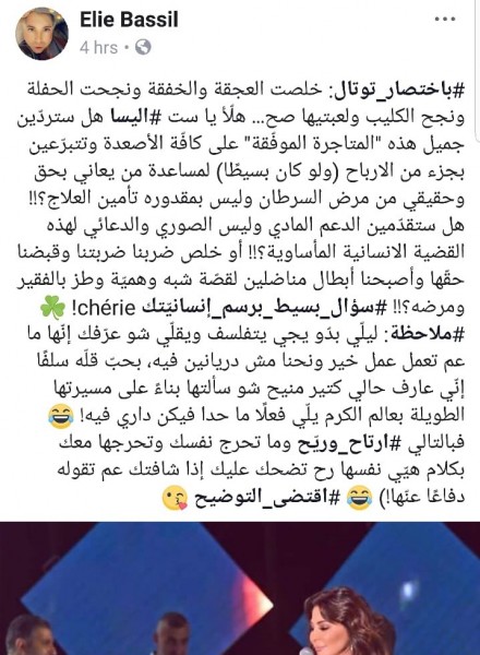 اتهم "الاعلامي الفني" ايلي باسيل الفنانة اليسا بالمتاجرة بمرضها، متوجهاً لها بالسؤال ما اذا كانت ستتبرّع بجزء من أرباحها في حفلها في أعياد بيروت الى الذين يعانون بحقّ من مرض السرطان وغير قادرين على تأمين العلاج.