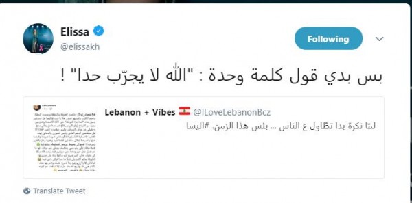 اليسا، وعبر صفحتها على "تويتر"، شاركت منشور احدى الصفحات التي تتابع الشؤون الفنية والتي علّقت على كلام باسيل باعتباره نكرة قائلة: "لمّا نكرة بدا تطّاول ع الناس ... بئس هذا الزمن"، معلّقة بدورها بالقول: "بس بدي قول كلمة وحدة : "الله لا يجرّب حدا"!"