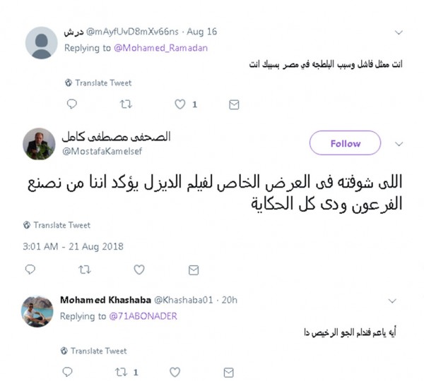 وكتب أحد النشطاء على "تويتر" تعليقًا قال فيه: "إنت ممثل فاشل والبلطجة في مصر بسببك إنت"، بينما علق آخر: "اللي شوفته في العرض الخاص لفيلم الديزل يؤكد أننا من نصنع الفرعون"، وكتب ثالثًا: "إيه ياعم فندام الجو الرخيص ده".
