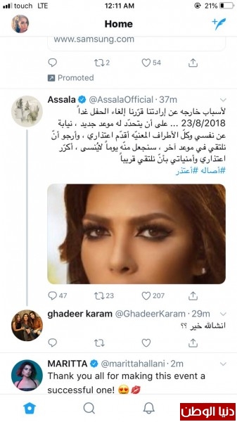 وعقب اعلان آصالة بانسحابها واعتذارها عن احياء الحفل تواصل معها عدد كبير من محبيها عبر وسائل التواصل الاجتماعي ليطالبوا بالعدول عن قرارها الصادم لهم.