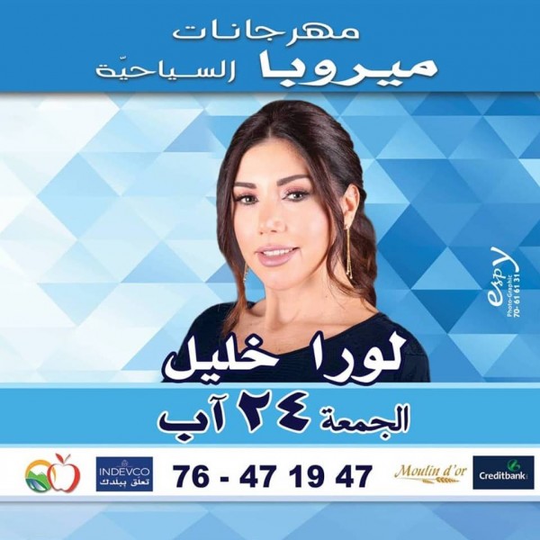 تحيي النّجمة لورا خليل حفلًا غنائيًّا ضخمًاعلى مدرج ميروبا السّياحي، وذلك مساء الجمعة الواقع في الرّابع والعشرين من الشّهر الحالي، ضمن مهرجانات ميروبا السّياحيّة .