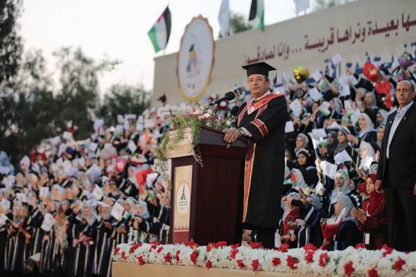 من جهته رحب رئيس الجامعة د. كمال الشرافي بالضيوف الكريم، شاكراً الجميع على تلبية الدعوة التي تعطي القليل من الفرح أمام الاحزان الكثيرة التي عايشها الشعب الفلسطيني، معرباً عن خالص تقديره لللجان التحضيرية للحفل التي ساهمت في رسم اللوحة الفنية لهذا الحفل البهيج، مبرقاً كلمة وفاء لفارس المسيرة التعليمية وزير التربية والتعليم العالي د. صبري صيدم الذي لم يتفانى يوماً عن تقديم يد العون والمساندة للجامعة وإيصالها لبرالأمان والاستقرار، كما وجه الشكر للجنود المجهولين الذين ساهموا بمسئوليتهم الوطنية العالية للوصول لتلك اللحظة الطيبة.