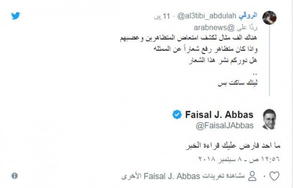 فقد أثارت ردود عباس، غضبًا عند كثير من المغردين السعوديين في موقع "تويتر"، إذ اعتبروا ردوده مهينة لهم ولا تليق برئيس تحرير صحيفة على حد وصف البعض منهم، وسط تكرار عباس بأنه لن يحذف المادة، ولم يجبر أحدًا على قراءتها.