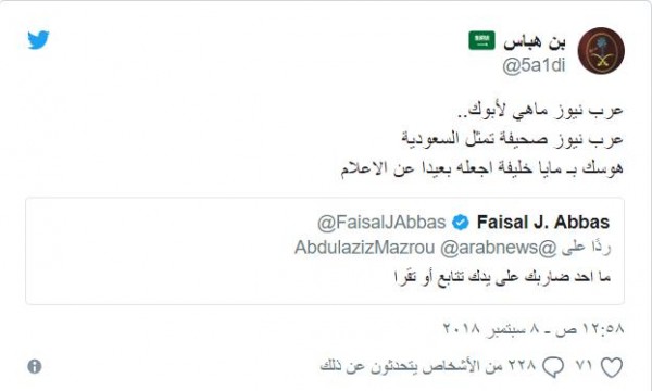 ولم تعلق وزارة الإعلام السعودية، ولا المجموعة السعودية للأبحاث والتسويق، التي تصدر عنها صحيفة "عرب نيوز"، على السجال الدائر بين كثير من السعوديين ورئيس تحرير الصحيفة الذي تولى مهامه في العام 2016.