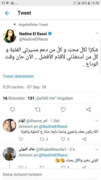 بعد تبادلها الاتهامات مع ابنها، ودعت الفنانة اللبنانية، نادين الراسي، معجبيها، حيث أغلقت حسابها الرسمي على "تويتر"، وأعلنت اعتزالها عالم الفن.