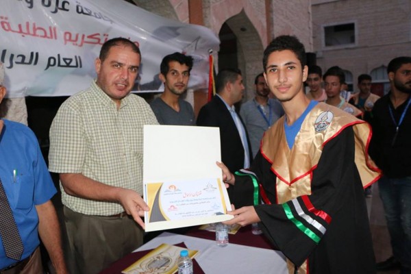 بداية رحب رئيس الجامعة بالحضور مقدماً تهانيه وتبريكاته للطلبة الناجحين وذويهم ومعلميهم وللأستاذ وليد على الجهد الكبير الذي بذلوه من أجل الوصول للنجاح مؤكداً أن تكريمهم واجب وطني وديني خصوصاً أن الطلبة تحدوا الحصار وقطع الكهرباء والظروف الصعبة التي يمر بها قطاع غزة مصممين على النجاح والتفوق ،كما تمنى رئيس الجامعة للطلبة الناجحين مزيداً من النجاح والتقدم مؤكداً أن الوطن بحاجة الي عقول وسواعد الشباب وخاصة الشباب المتعلم والمثقف ، كما قدم رئيس الجامعة شرحاً عن الجامعة ونشأتها ومراحل تطورها وصولاً للأفواج التي تم تخريجها معبراً عن سعادته بالمستوي الطيب والقوي لخريجي جامعة غزة الذين التحقوا بسوق العمل الفلسطيني ، مؤكداً أن جامعة غزة تسعى لتعليم وتخريج طالب متعلم ومثقف ومتدرب متسلح بالخبرة العملية من خلال وجود المختبرات الحديثة التي توفرها جامعة غزة لأبنائها الطلبة كاستديو التصوير التابع لقسم الإعلام ومختبرات الحاسوب التابعة لكلية الحاسوب والمحكمة الصورية التابعة لكلية القانون وكذلك مختبر اللغات التابع لكلية علوم الاتصال واللغات كما تحرص الجامعة بتوفير كادر أكاديمي مميز من ذوي الخبرة الأكاديمية العالية .