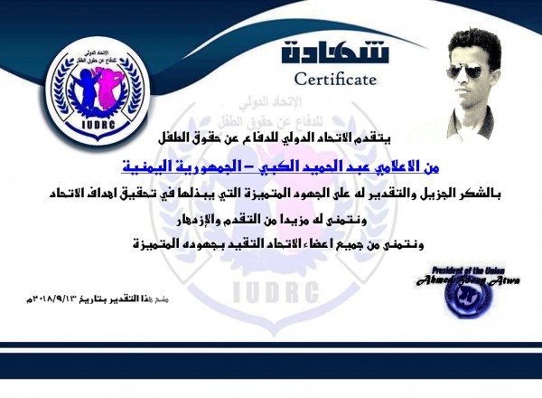 وكرم الاتحاد في هذه الاونه عدد من الناشطين وكان من ضمنهم سفير الاتحاد الدولي للدفاع عن حقوق الطفل الاعلامي عبدالحميد الكبي في الجمهورية اليمنية والذي يعمل بكل جهد وجدية من اجل حقوق اطفال اليمن.