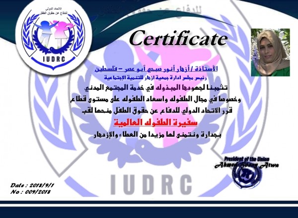منح الاتحاد الدولي للدفاع عن حقوق الطفل الاستاذة ازهار ابو عصر رئيس مجلس ادارة جمعية ازهار للتنمية الاجتماعية من فلسطين لقب سفيرة الطفوله العالمية نظرا لجهودها المتميزة في اسعاد وخدمة الطفوله في قطاع غزة.