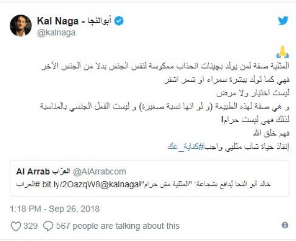 "المثلية صفة لمن يولد بچينات انحذاب معكوسة لنفس الجنس بدلا من الجنس الآخر فهي كما تولد ببشرة سمراء او شعر اشقر ليست اختيار ولا مرض و هي صفة لهذه الطبيعة (و لو انها نسبة صغيرة) و ليست الفعل الجنسي بالمناسبة لذلك فهي ليست حرام! فهم خلق الله إنقاذ حياة شاب مثليي واجب.. كفاية عك".