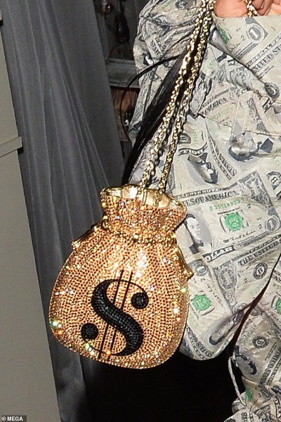 فبمعطف طويل مطبوع عليه بالكامل أوراق نقدية فئة الدولار من الماركة الإسبانية "Balenciaga"، و"بوت" عالى يصل إلى الفخذ مطابق لنفس تصميم المعطف، وحقيبة ذهبية متوجه بعلامة الدولار هى الأخرى، توجهت "كيم" إلى حفلة صديقتها التى تحتفل بحصولها على ثروة بعد بيعها لشركتها، وبالرغم من أن "كيم" لم تعلن عن هوية صديقتها، ولكنها نشرت فيديو فى خاصية "ستورى" من غرفة ملابسها على حسابها على الإنستجرام تبرر فيه سبب هذا المظهر اللافت، قائلة "ماذا تفعل حينما تقوم إحدى أصدقائك ببيع شركتها مقابل مليارين؟ الإجابة أن ترتدى زى كامل من النقود وتقيم لها حفلة"، ثم عرضت صورة لها فى زيها الجديد وصورة لحقيبتها المتلألأة.