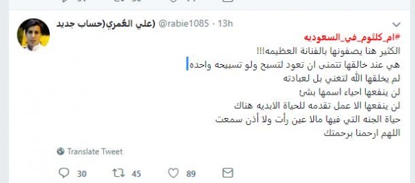 وعلى نفس المبدأ غرد علي العمري: "الكثير هنا يصفونها بالفنانة العظيمه!!!هي عند خالقها تتمنى ان تعود لتسبح ولو تسبيحه واحده لم يخلقها الله لتغني بل لعبادته لن ينفعها احياء اسمها بشئ لن ينفعها الا عمل تقدمه للحياة الابديه هناك حياة الجنه التي فيها مالا عين رأت ولا أذن سمعت اللهم ارحمنا برحمتك".