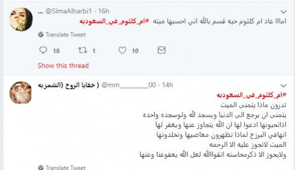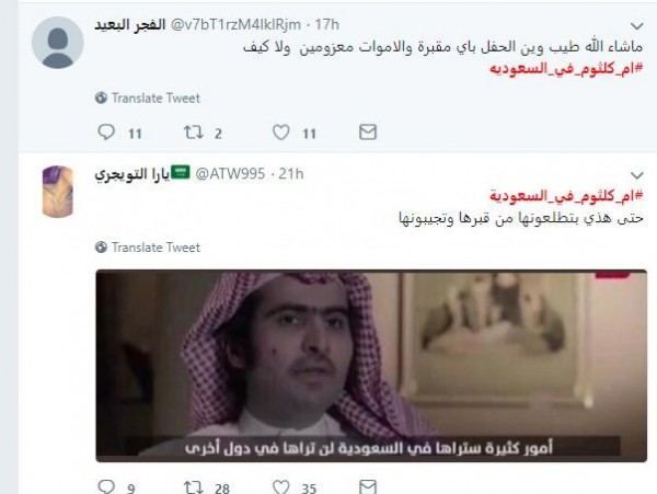وحاول مغرد يحمل اسم "ابو العز" أن يثني الجماهير عن القرار، مُدعياً أن أم كلثوم تتمنى ألا يحضر أحد حفلها، فكتب: "ممكن كلامي ماراح يغير قناعتكم بعدم حضور الحفل في حال أقاموه ولكن لكم أن تتصوروا أن هذا الشخص في القبر يتمنى يرجع للدنيا حتى يتوب الى الله ويترك المعازف والغناء وأنتم ترجعون تستذكرون هذا المنكر ة".