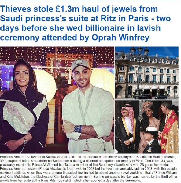 وأوضحت الصحيفة أن أميرة سعودية، فقدت مجوهراتها المقدرة بمليون دولار، وربما تكون أميرة الطويل، طليقة الملياردير الوليد بن طلال والزوجة الحالية للملياردير الإماراتي خليفة المهيري، الذي يعتبر سابع أغنى رجل في الإمارات.