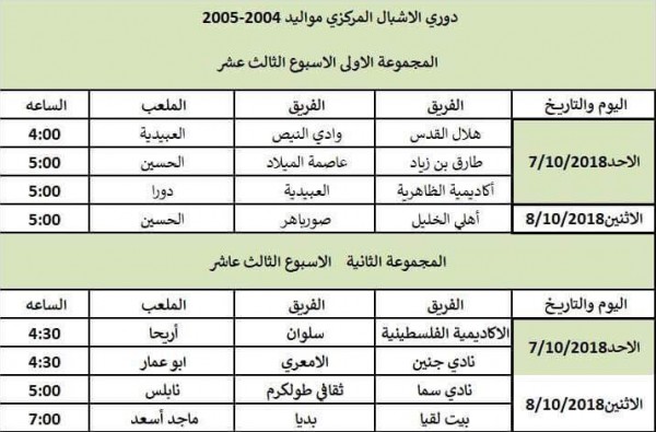 أعلنت لجنة المسابقات في اتحاد كرة القدم عن جدول مباريات الاسبوع الثالث عشر لدوري مواليد 2004/2005 المركزي لكرة القدم كالتالي:
