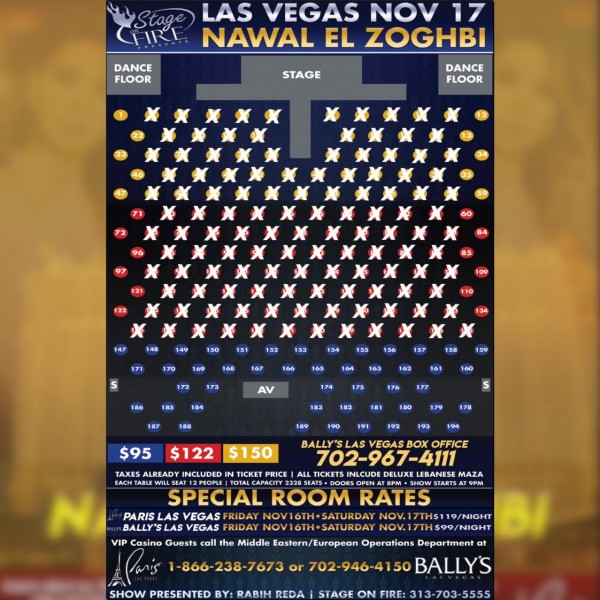 يشهد حفل النجمة الذهبية نوال الزغبي الذي سيقام بتاريخ 17 نوفمبر المقبل، في فندق (باريس) في صالة Bally's الضخمة، إقبالاً كبيراً جداً على حجز التذاكر، حيث تم حجز 2000 كرسيّ، خلال 72 ساعة أي 3 أيام فقط على فتح باب الحجوزات، وهي سابقة في تاريخ حفلات النجوم العرب في الولايات المتحدة الأميركية.