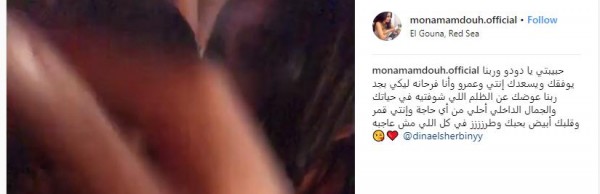شاركت الفنانة الشابة منى ممدوح جمهورها، فيديو يجمعها بالفنانة دينا الشربيني، وعلّقت عليه قائلة :"حبيبتي يا دودو وربّنا يوفّقك ويسعدِك إنتِ وعمرو، وأنا فرحانه ليكي بجدّ ربّنا عوّضِك عن الظلم اللي شوفتيه في حياتِك، والجمال الداخلي أحلى من أيّ حاجة وإنتِ قمر وقلبِك أبيض.. بحبّك".