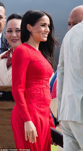 والتقط مصورون صحفيون الصور الطريفة لميغان عند وصولها إلى مطار فوا أموتو في عاصمة البلاد، عندما رحب بهما الأميرة أنجيليكا لاوفوبيكا والراقصون في التنانير الخشبية، وتم اصطحابهما إلى مقر القنصلية لجمهور خاص مع الملك توبو السادس والملكة ناناسيبوو، حيث حضروا حفل استقبال رسمي وعشاء، يضم الترفيه التقليدي.