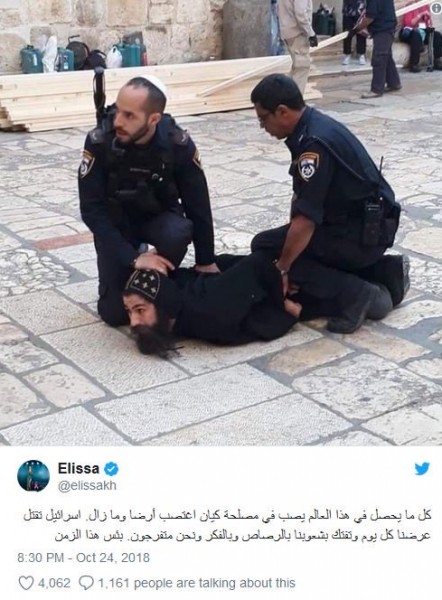 استنكرت الفنانة اليسا تعرّض شرطة الاحتلال الاسرائيلي لعدد من آباء وشمامسة كنيسة دير السُلطان التابعة للكنيسة الأرثوذكسية المصرية في القدس، قائلة: "كل ما يحصل في هذا العالم يصب في مصلحة كيان اغتصب أرضاً وما زال. اسرائيل تقتل عرضنا كل يوم وتفتك بشعوبنا بالرصاص وبالفكر ونحن متفرّجون. بئس هذا الزمن".