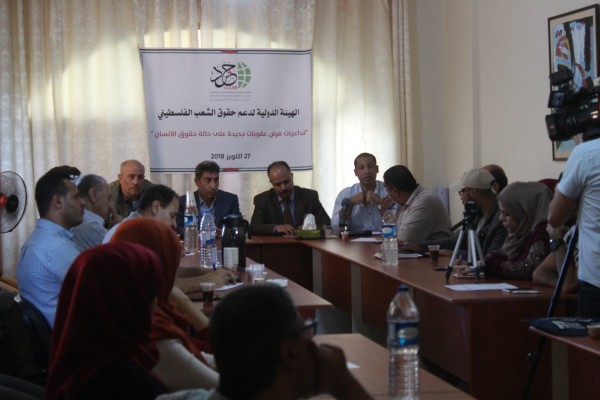 نظمت الهيئة الدولية لدعم حقوق الشعب الفلسطيني (حشد) اليوم الأحد الموافق28 أكتوبر / تشرين الأول 2018، ورشة تحت عنوان" تداعيات فرض عقوبات جديدة على حالة حقوق الإنسان"، وذلك وسط مشاركة لفيف من السياسيين والمخاتير والوجهاء والنشطاء، في مقر الهيئة بمدينة غزة.