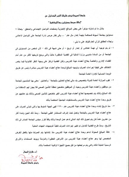 بشأن ما تم تداوله مؤخراً على بعض المواقع الإخبارية وصفحات التواصل الاجتماعي والمتعلق " بإحالة 7 مسئولين بجامعة أسيوط للمحاكمة بتهمة إهدار مال عام " ،،، وفى إطار حرص إدارة الجامعة على التواصل الاعلامى وإجلاء الحقائق للرأي العام فنؤكد على ما يلي :