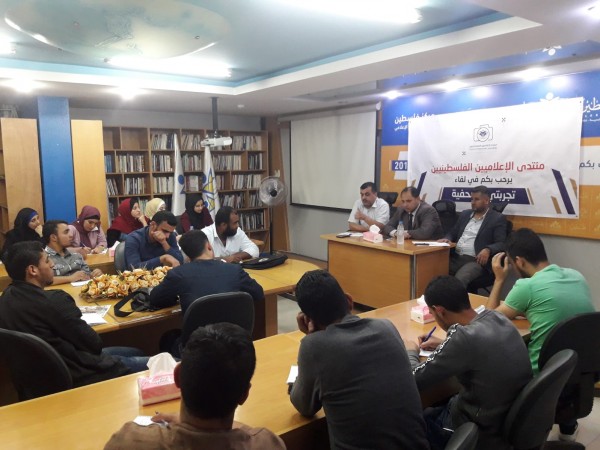نظم منتدى الإعلاميين الفلسطينيين، لقاء بعنوان "تجربتي الصحفية" لحشد من طلبة الإعلام في الكلية الجامعية، وذلك في قاعة مركز تدريب صحيفة فلسطين المحلية بغزة، تحدث خلاله الصحفي علي البطة رئيس غرفة الأخبار بالصحيفة ومدير المنتدى الصحفي محمد ياسين عن تجاربهما في العمل الصحفي.