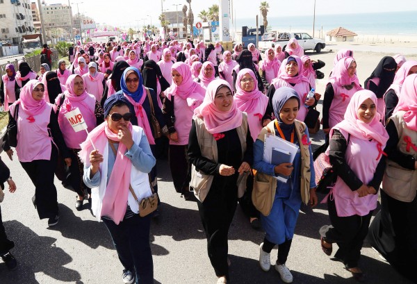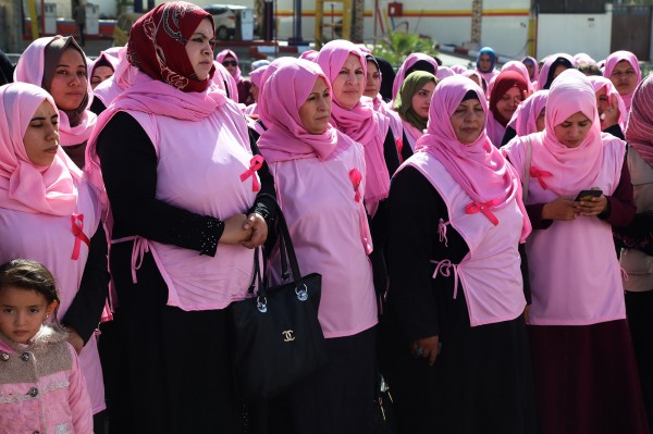 شاركت عشرات النساء الفلسطينيات في قطاع غزة، اليوم الثلاثاء، في مسيرة وردية للتوعية بمرض سرطان الثدي، ومساندة حق المريضات بضرورة تلقى رعاية صحية متكاملة بالقطاع وحقهن بالعلاج بالخارج.