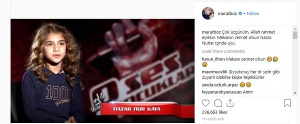وتفاعلاً مع الخبر الحزين، أعرب الفنان التركي مراد بوز، عن حزنه بالخبر المفجع من خلال نشر صورة "نظر" التي كانت في فريقه بـ The Voice Kids عبر حسابه الخاص بموقع التواصل الإجتماعي انستغرام.