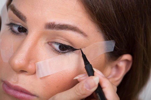 استخدمي الشريط اللاصق لتحديد رسمة "عين القطة" بطريقة مثالية، فقط عليك وضع قطعتين من الشريط ولصقهما في زاوية ثم ملء الفراغ بين الشريطين.