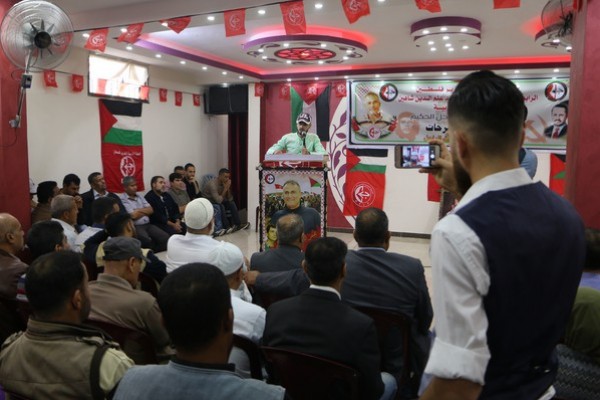وازدانت القاعة بأعلام فلسطين ورايات الجبهة وبصورة الراحل وقادة ورموز وشهداء الجبهة.