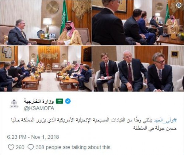استقبل ولي عهد السعودية، محمد بن سلمان، وفدا من قادة المسيحيين الإنجيليين بأمريكا، ضم شخصيات مؤيدة لإسرائيل، وذلك في خطوة نادرة لإظهار المزيد من الانفتاح والتسامح الديني.