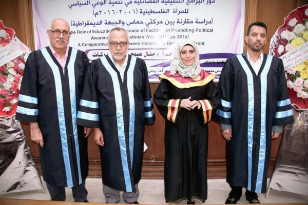 منحت جامعة الأزهر بغزة، الطالبة منال صبحي بركات، درجة الماجستير في دراسات الشرق الأوسط، عن أطروحتها الموسومة بـ"دور البرامج التثقيفية الفصائلية في تنمية الوعي السياسي للمرأة الفلسطينية 2006-2016م- دراسة مقارنة بين حركة حماس والجبهة الديمقراطية".