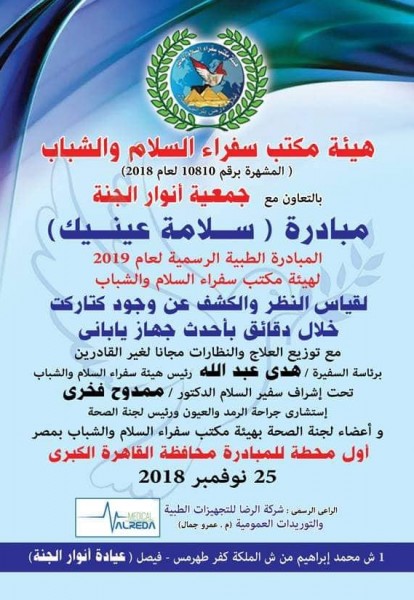 أوضحت السفيرة هدى عبد الله أن مبادرة سلامة عينيك أولى المبادرات الطبية الرسمية لعام 2019 لهيئة مكتب سفراء السلام والشباب ستبدء من القاهرة الكبرى يوم 25 نوفمبر 2018 وأنه سيتم توزيع العلاج والنظارات لغير القادرين مجانا تحت إشراف سفير السلام الدكتور ممدوح فخرى استشارى جراحة الرمد والعيون ورئيس لجنة الصحة.