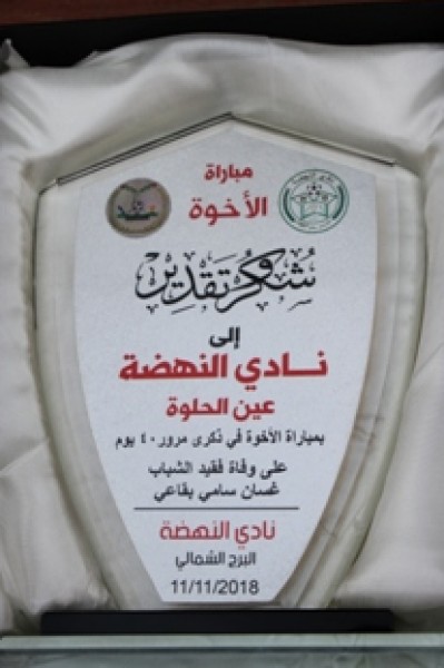 تكريماً لذكرى المرحوم الشاب غسان سامي البقاعي أقام نادي النهضة الرياضة - عين الحلوة مباراة في لعبة كرة القدم على أرض ملعب كلية سبلين بين فريقي: نادي النهضة عين الحلوة ونادي النهضة برج الشمالي . بمناسبة ذكرى اربعين يوماً على رحيل فقيد الشباب المرحوم باذن الله غسان سامي البقاعي . بداية المباراة افتتحت بتلاوة الفاتحة عن روح المرحوم غسان سامي البقاعي ثم بكلمة من رئيس نادي النهضة رجل الاعمال زياد البقاعي شكر فيها كلية سبلين على استضافتهم هذه الذكرى .