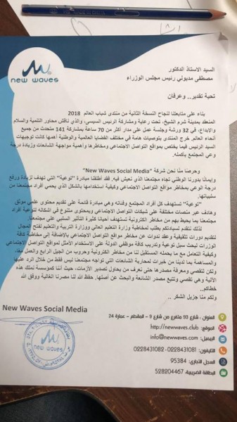 يذكر أن مبادرة "توعية" أطلقتها شركة New Waves انطلاقا من إيمانها بدورها الوطني والتوعوي تجاه المجتمع، وتستهدف شباب الجامعات والمدارس وأولياء الأمور، وذلك لتدعيم أركان الدولة وتقويتها عن طريق إكسابها الخبرات الكافية في مجال السوشيال ميديا ومواجهة الحروب النفسية والإرهاب وعصابات الجريمة المنظمة.