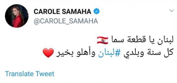 شاركت النجمة كارول سماحة تغريدة عبر حسابها الشخصي على تويتر عايدت من خلالها الشعب وكتبت: "لبنان يا قطعة سما. كل سنة وبلدي لبنان وأهله بخير".