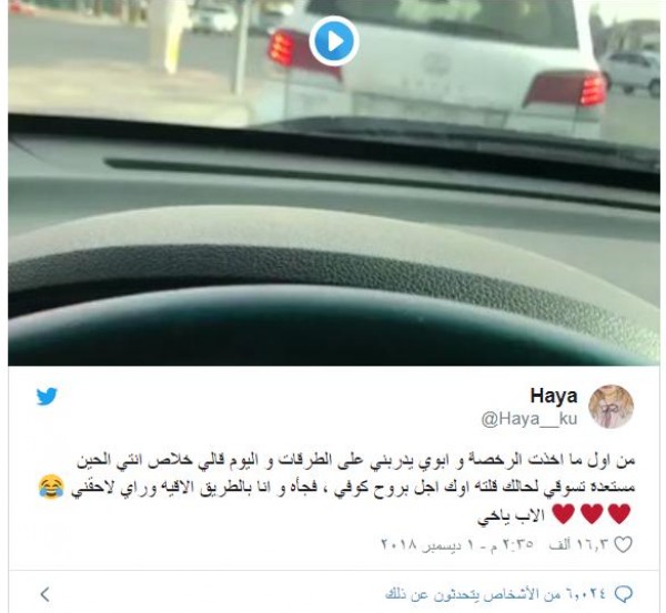 كشفت فتاة سعودية عن موقف مؤثر لوالدها واهتمامه بعد قيامه بتعليمها القيادة وتمكنها من الحصول على الرخصة، وذلك عبر مقطع فيديو نشرته في حسابها على موقع تويتر, ويتضح من خلال المقطع وجود الأب بسيارته خلف سيارة ابنته حرصاً وخوفاً عليها.