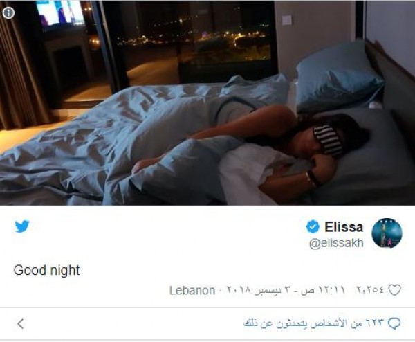 وأرفقت اليسا، تغريدتها، بصورة لها، وهي نائمة في غرفة نومها، وتبدو غرفتها مطلّة من إرتفاعٍ شاهق.