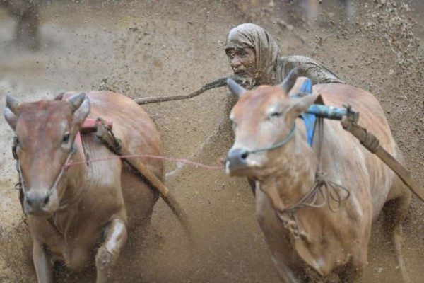 ليس لأصحاب القلوب الضعيفة.. سباق ثيران تقليدي في الوحل في إندونيسيا